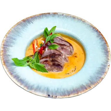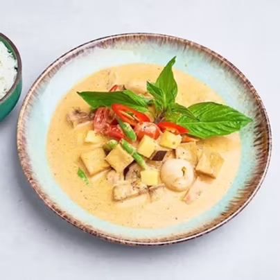 Wolno gotowana wieprzowina w tradycyjnym czerwonym curry, podawana z zieloną fasolką oraz bakłażanem.