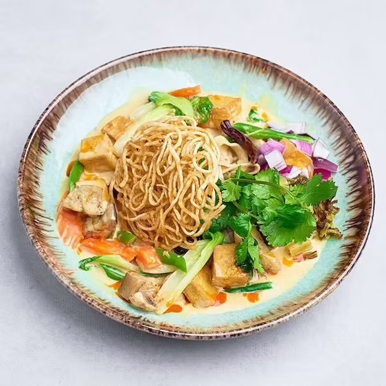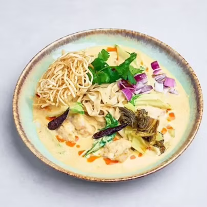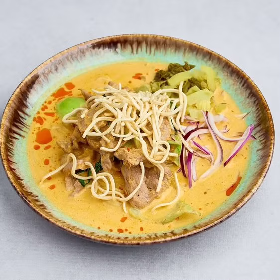 Lekko pikantne kokosowe curry z północy Tajlandii, podawane z makaronem jajecznym w dwóch formach – smażonej i gotowanej, z cebulką oraz fermentowaną tajską kapustą.