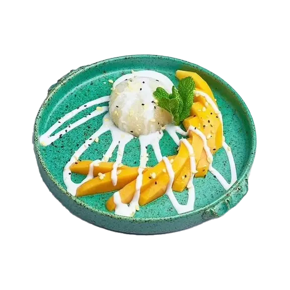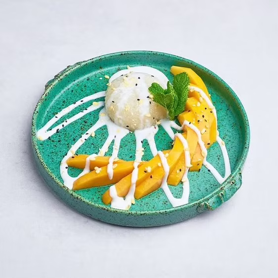 Kleisty ryż z krojonym mango i słodką polewą kokosową.