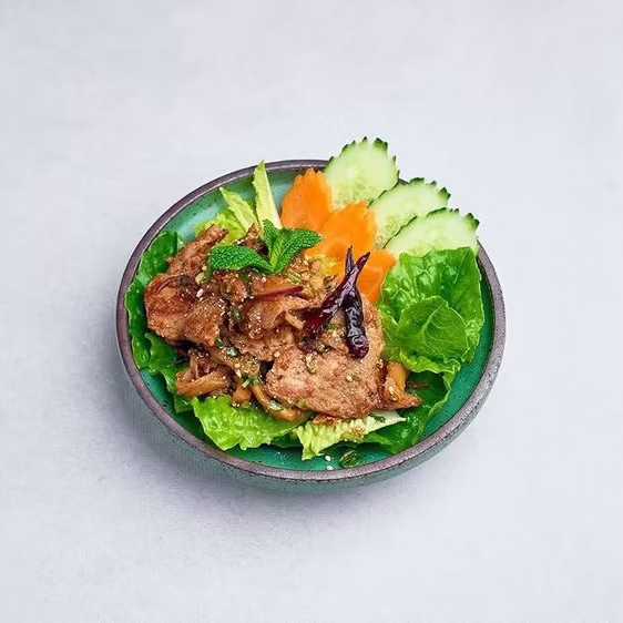 Pikantna sałatka z mieloną wieprzowiną, doprawiona sosem rybnym, pieprzem cayenne i tradycyjnymi przyprawami tajskimi.