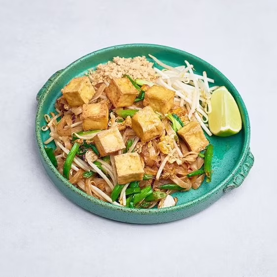 Smażony makaron ryżowy z sosem z tamaryndowca, jajkiem, kiełkami, orzeszkami i szczypiorkiem.