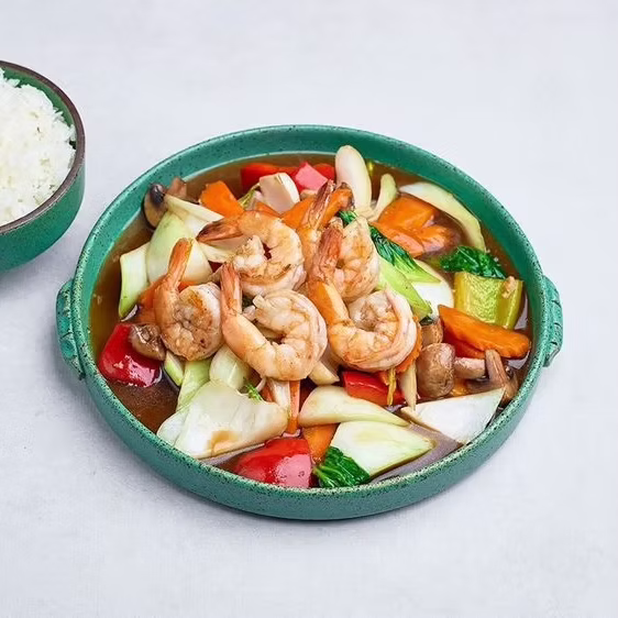 Kapusta pak choi smażona w sosie ostrygowym i sojowym, podawana z krewetkami i ryżem jaśminowym.