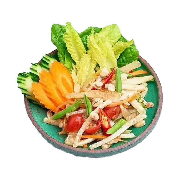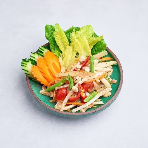 Pikantno-kwaśna sałatka z zielonej papai, z dodatkiem fasolki, pomidorów, czosnku i tajskiego chilli.