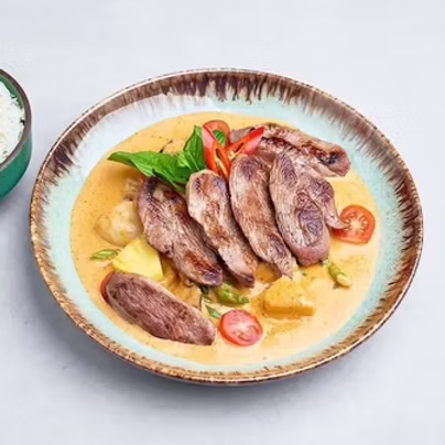 Delikatne, kokosowe czerwone curry ze słodkimi owocami liczi i chrupiącą zieloną fasolką, doprawione liśćmi kaffiru.