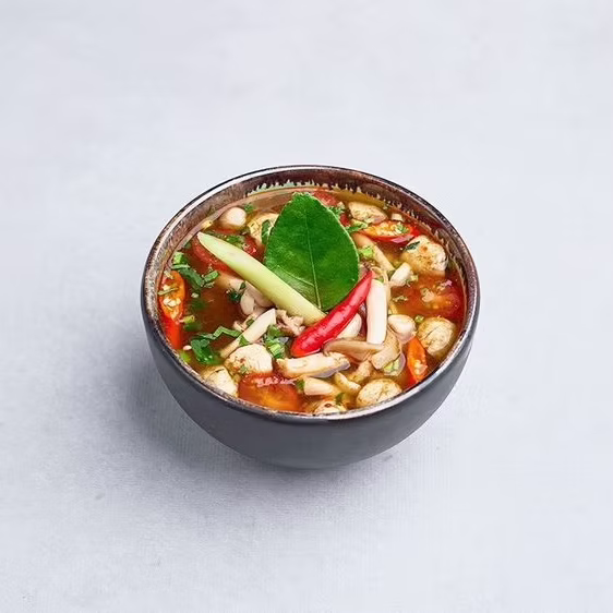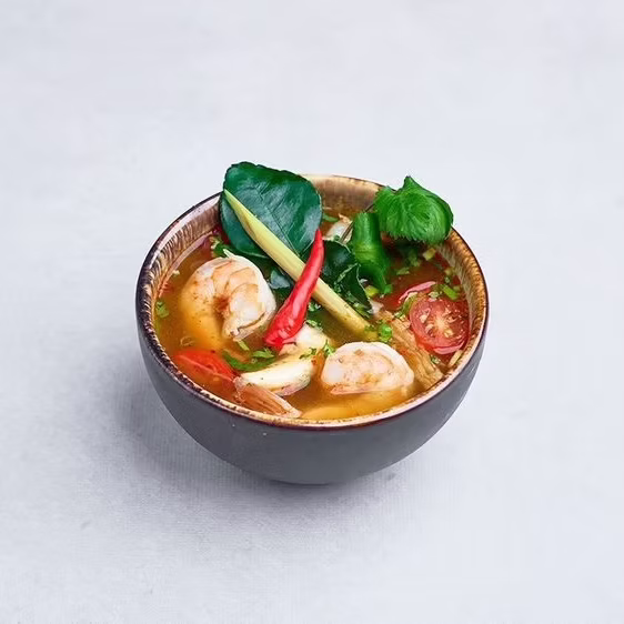 Tradycyjna tajska zupa z krewetkami na bazie mleka kokosowego oraz galangalu.