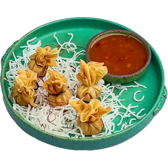 Delikatne pierożki wonton z pełnym smaków farszem z wieprzowiny i krewetek, z grzybami shitake i kolendrą, podawane z aromatycznym sosem.