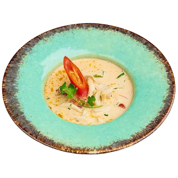 Tradycyjna tajska zupa z kurczakiem na bazie mleka kokosowego oraz galangalu.